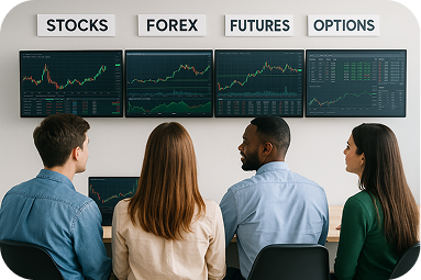 Ofrecemos formación en diferentes mercados financieros, como forex, futuros, acciones y opciones financieras.